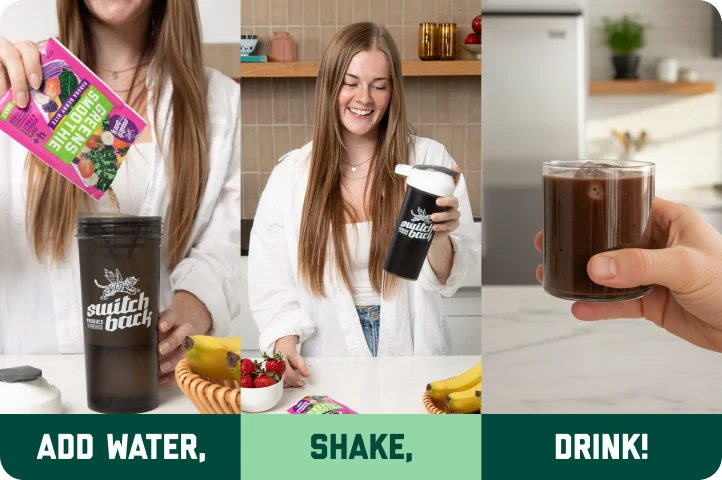 Each packet delivers over 5 servings of whole fruits and veggies that are freeze dried and ground into a convenient mix. No fillers. No junk. Just produce you can pronounce. Food > Supplements is the Switchback standard.