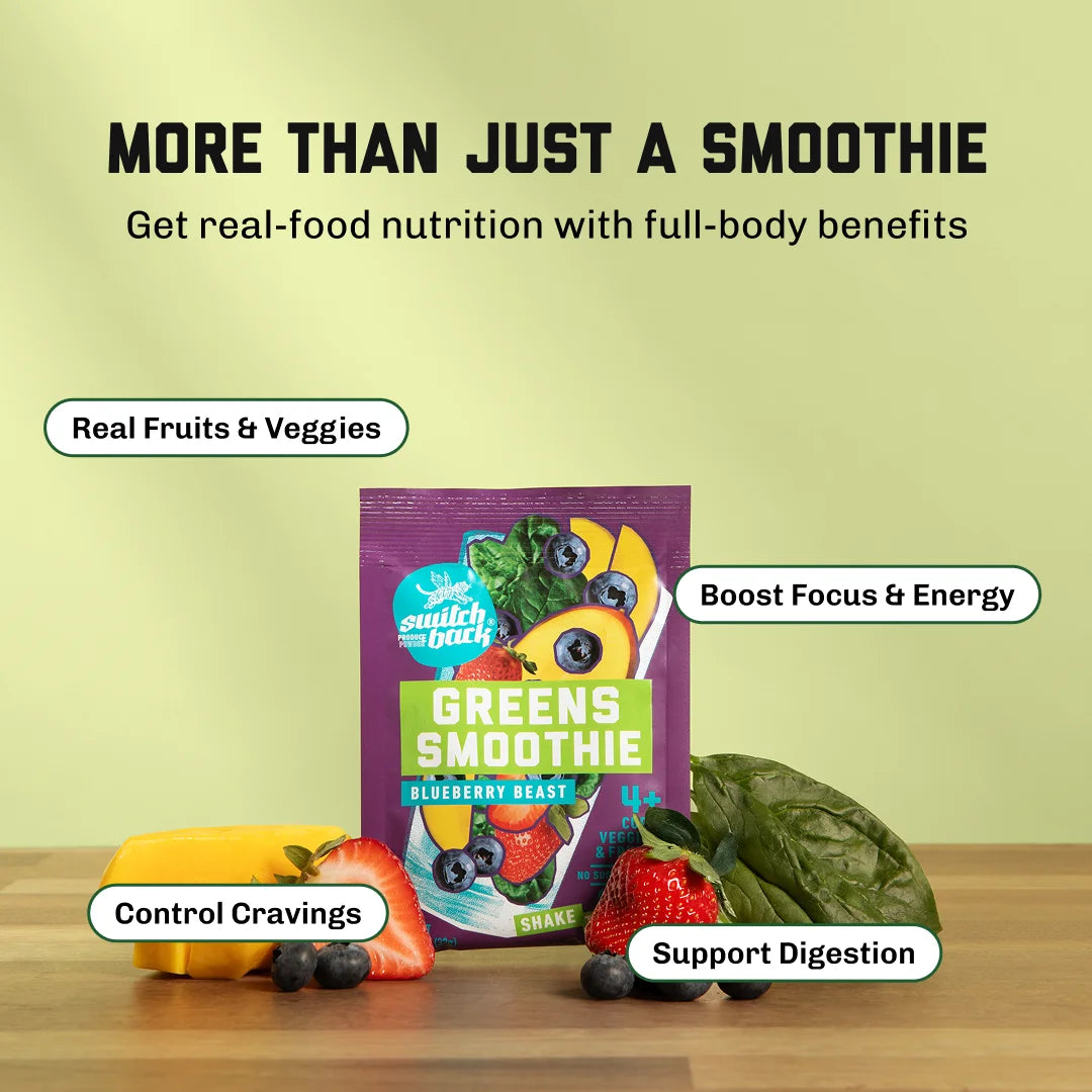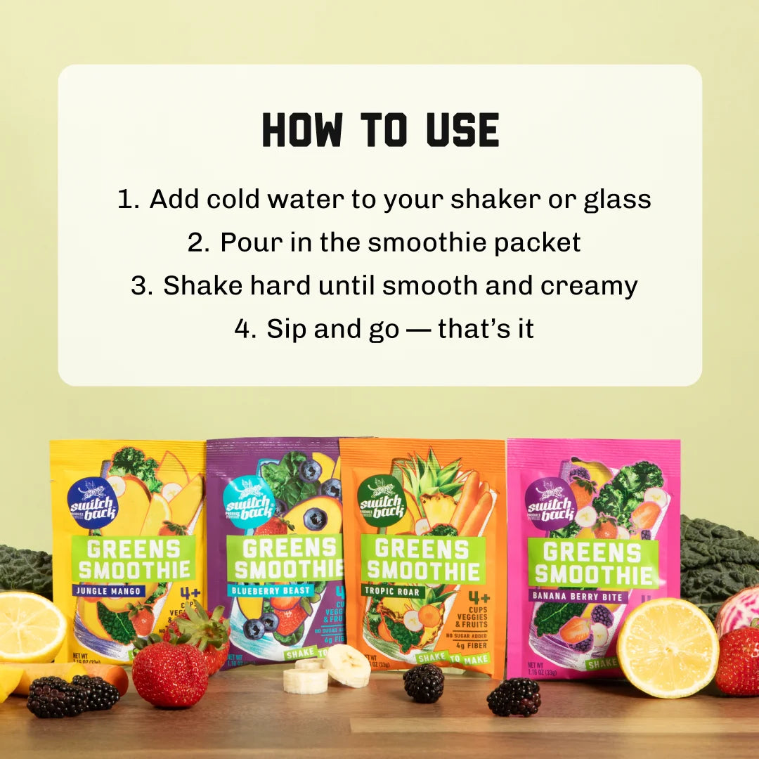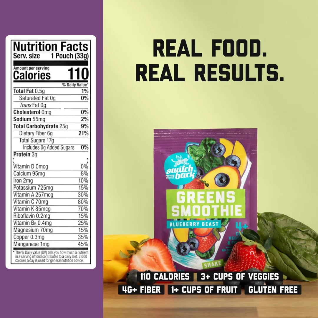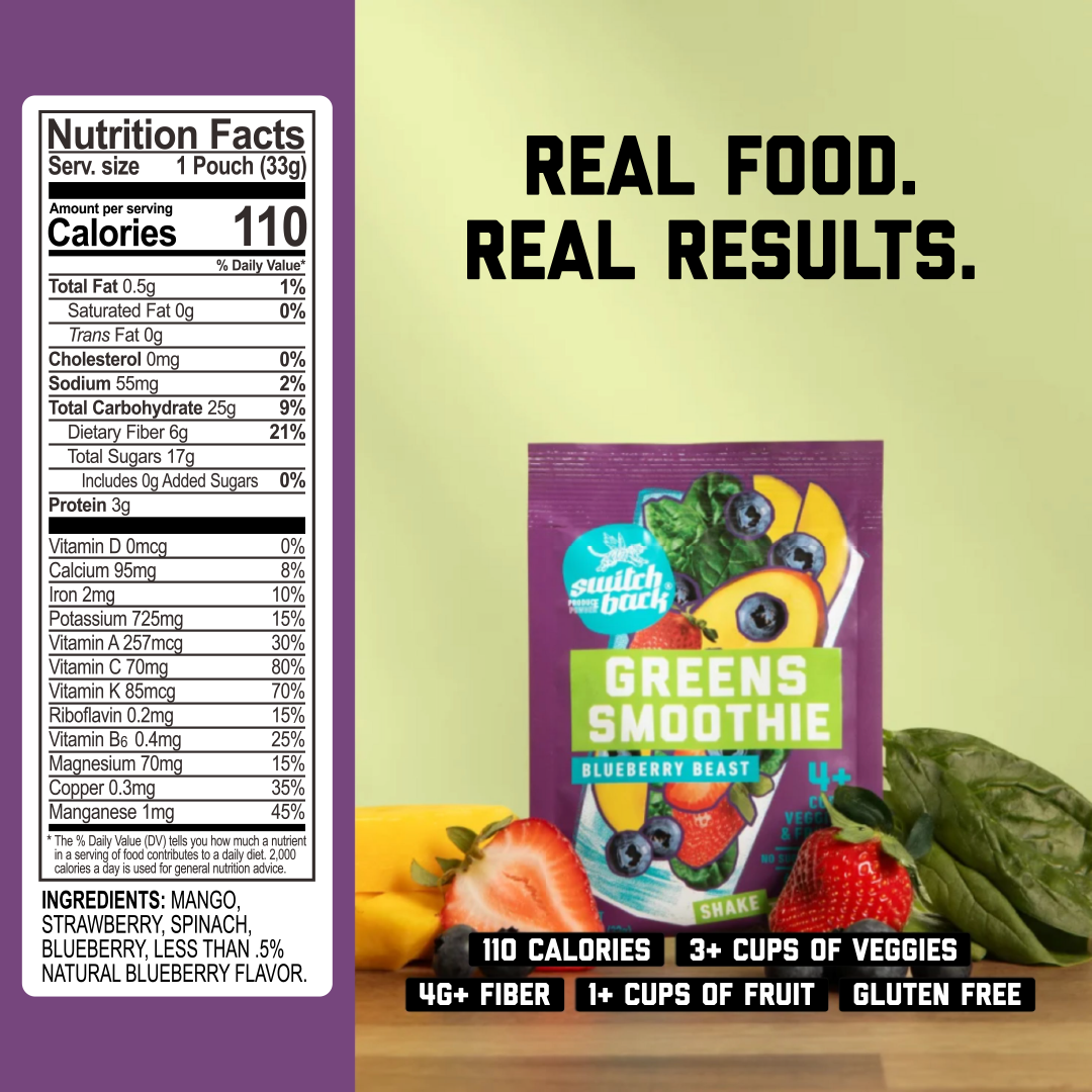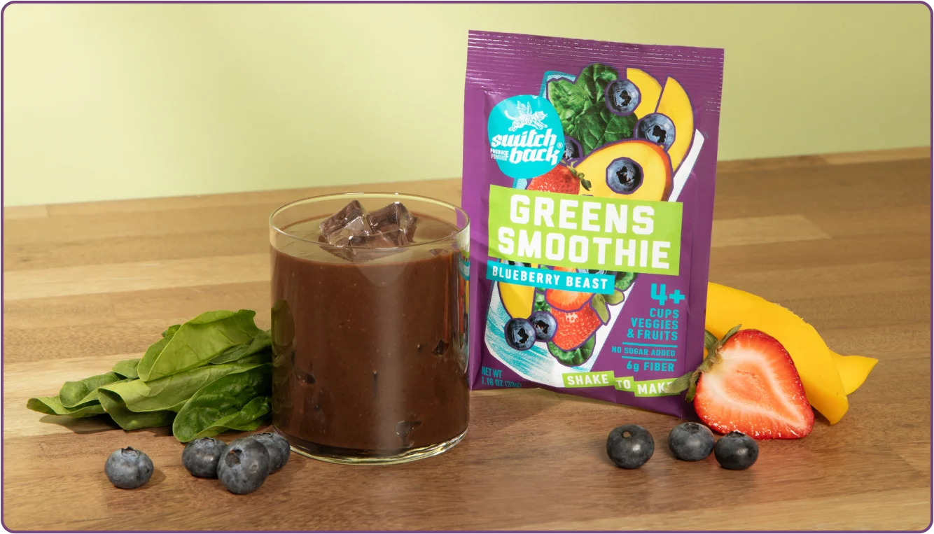 Each Switchback smoothie starts with real, whole produce — the kind you’d buy fresh if you had the time. We lock in nutrients, freshness, and flavor by skipping the heat and using a gentle freeze-drying process that keeps the good stuff intact.
